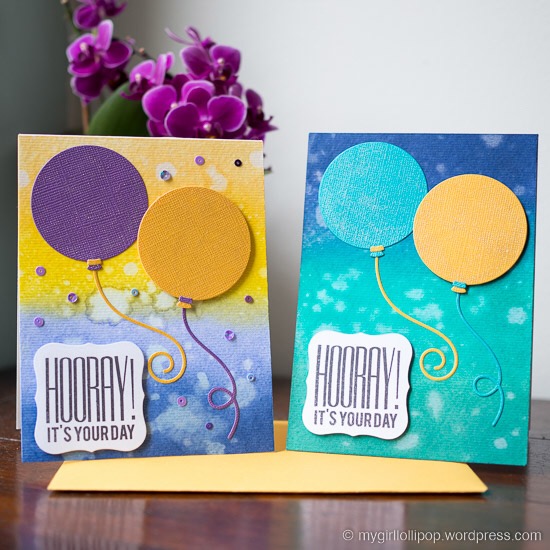 I saw this fabulous card by Melania Deasy, who designs for MFT. I just had to have a go at making one myself, using distress inks and the Lawn Fawn party balloon dies.