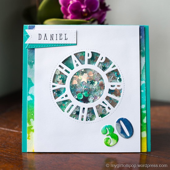 August is the busiest month for birthdays in my family. I thought I’d have another go at using the MFT Birthday Centerpieces Die-namic, this time with more green/blue colours and loads more sequins!