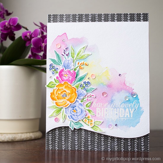 For this birthday card, I wanted to try layering flowers over a watercolour background.