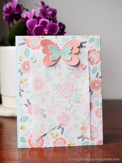 The vellum is attached to the card behind the butterfly and also with glue behind the sentiment. I then finished the card with some sequins.