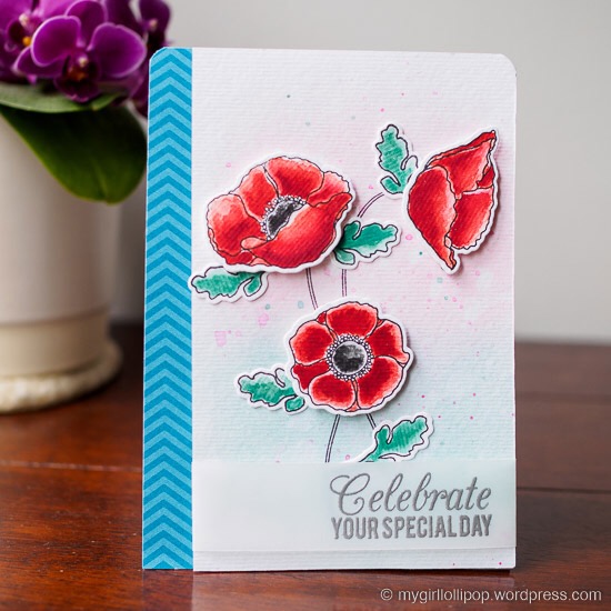 The new ‘Delicate Poppies’ stamp set from My Favourite Things is perfect for watercolouring and I couldn’t wait to try it with my distress inks.