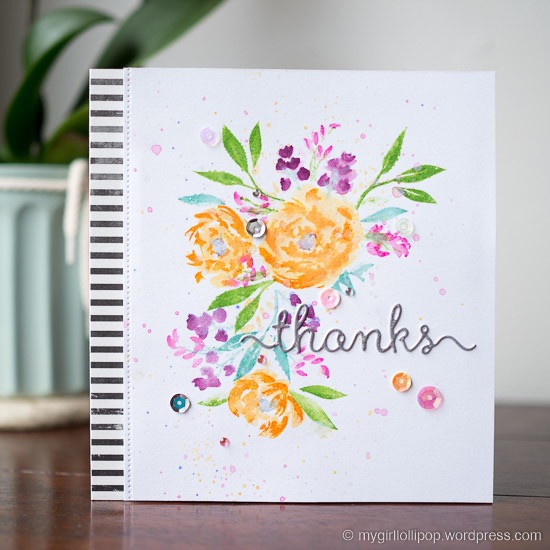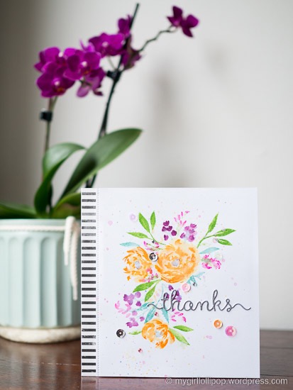 I had a very important thank you card to make. I wanted to use a watercolour stamping technique I’d seen others use, and the WPlus9 Pretty Peonies set is perfect for this.