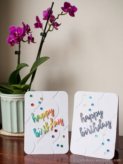 I blended several distress ink colours on watercolour card, then spritzed them with water. I dried it with a heat tool, then die cut the words ‘happy birthday’ from it.