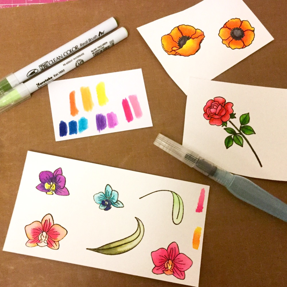 Blending is effortless, even without water. The orange poppies in the photo above are blended without water. The rose image is blended with a water brush pen.