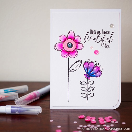 Having recently got some Zig Clean Colour Real Brush pens, I wanted some stamped images to colour in. The WPlus9 Doodle Buds stamp set is a really fun set of flower images, leaves and stems. It’s great for a variety of colouring techniques too.