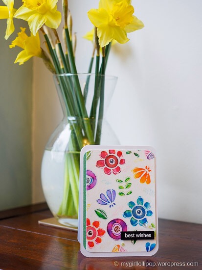 I cut a piece of watercolour card to a6 size. I then stamped flowers and leaves from the WPlus9 doodle buds stamp set in Versamark ink and heat embossed them with sparkle embossing powder. It’s difficult to see the sparkle in the photo but it’s really pretty in real life.