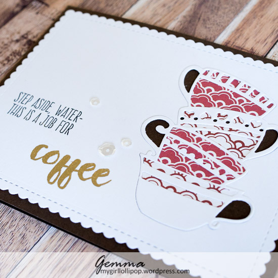 Before attaching the card rectangle to a dark brown card base, I stamped a sentiment from the Altenew Coffee Talk stamp set and heat embossing the word coffee in gold. I love the fonts in this set.