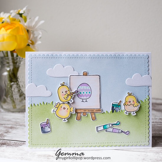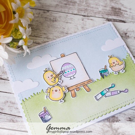 I’ve been having a lot of fun with the Mama Elephant Lil’ Painters Stamp Set. The images of rabbits and chicks painting are so sweet!