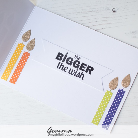 For the inside of the card, I wanted to continue the sentiment. At this point, I wasn’t brave enough to stamp it directly in the card, in case I ruined it. I do struggle sometimes with part stamping! So instead, I stamped it on a separate piece of card and adhered it inside. I had a few candles left over so added them too.