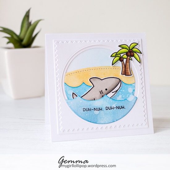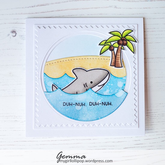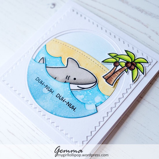 The shark is from the Lawn Fawn Duh Nuh stamp set, and the palm trees from Lawn Fawn Ahoy Matey. I used alcohol markers to colour them in, and fussy cut them out.