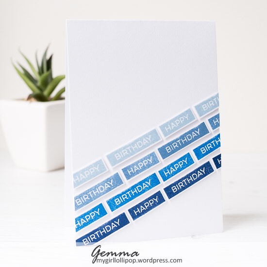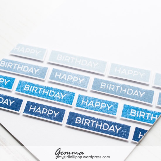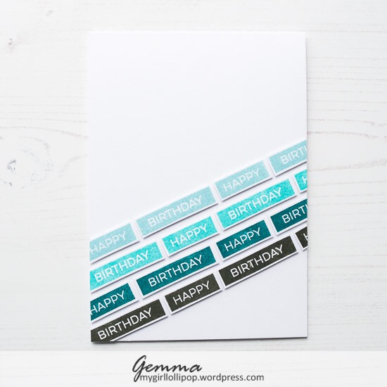 I’m really loving typographic cards at the moment, with text as the main focal point. For these cards, I used the MFT label makers sentiments, stamping them repeatedly in various shades of blue and green MFT inks, then fussy cutting them out.