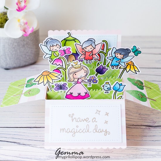 I first stamped, coloured and cut out lots of images from the Lawn Fawn Fairy Friends stamp set. As Lawn Fawn don’t have a fairytale set (hint hint, Lawn Fawn!), I chose one of the princesses from the MFT Once Upon a Time stamp set. I also added some butterflies and the bird from that set too.