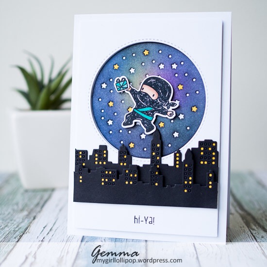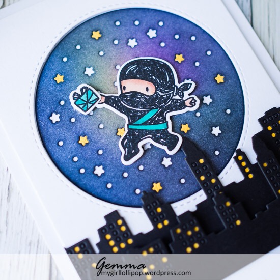I stamped and cut out a ninja and present, colouring them with copics. I adhered them to the starry sky with more foam tape.