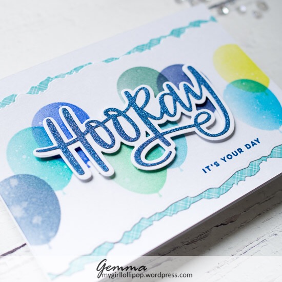 Next, I die cut the Hooray word die from glitter paper. 8 did cut the shadows from white card, which allows the word to stand out from the background.