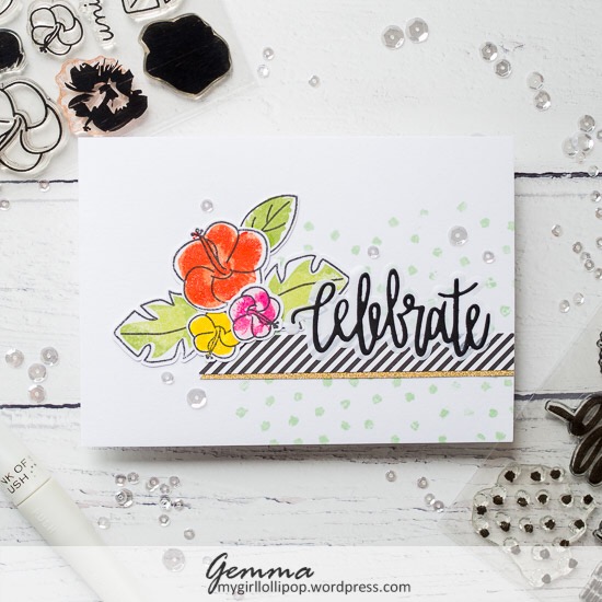 The flowers are from the Waffle Flower Hibiscus stamp set, stamped in MFT inks and Wink of Stella glitter. I layered them onto a strip of MFT patterned paper, accented with a thin gold glitter strip.