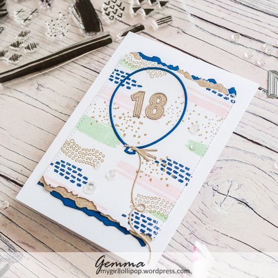 I used another great C&9th die set to add an ’18’ to the balloon, in gold glitter paper. I also added the balloon string and tassel. To finish, I added a few sequins from Pretty Pink Posh.