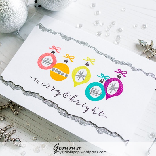 I did all the cards in stages, and started with the stamping. A stamp positioner is a big help for this part. Once I’d stamped all the baubles, I heat embossed in silver, the decorative elements. Then I added the sentiment in black ink.