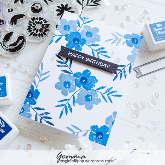 I chose three colours of MFT inks – Blue Yonder, Cornflower, and Blueberry – and stamped clusters of flowers and leaves onto a white card base. I didn’t do any masking, just selective inking for the leaves so they didn’t overlap the petals.