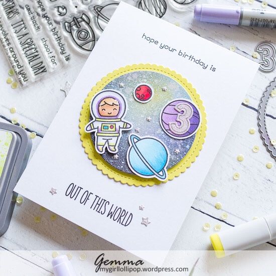 I then die cut a larger scalloped circle from white card, and blended on some twisted citron distress oxide ink. I layered the circles on to a card base, using some foam tape behind the galaxy layer.