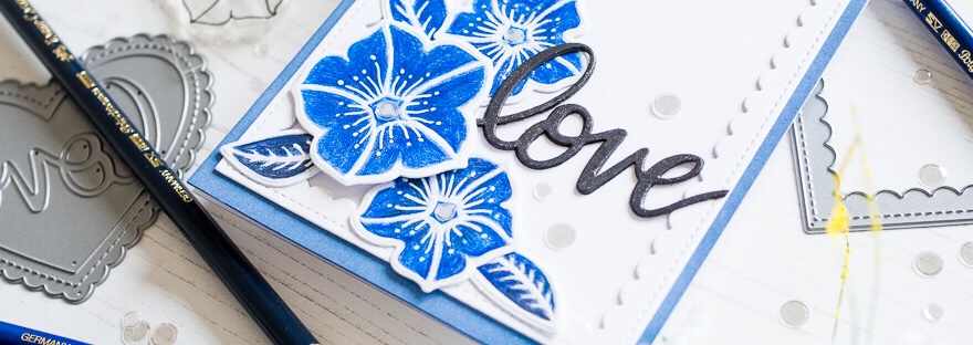 I’m continuing my love of blue and white florals with my card today. This time, I’m using colouring pencils for a different look.