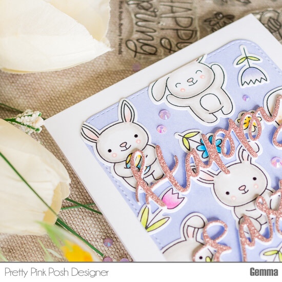 Today I’m sharing an Easter card, featuring the adorable new Bunny Friends stamp set and the Happy Easter script die by Pretty Pink Posh. These are both part of the next release, arriving on March 1st!