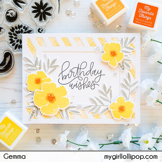 I began by stamping some flowers from the MFT Brushstroke Blooms stamp set. I used MFT dye inks. Then I cut the images out with the coordinating dienamics.