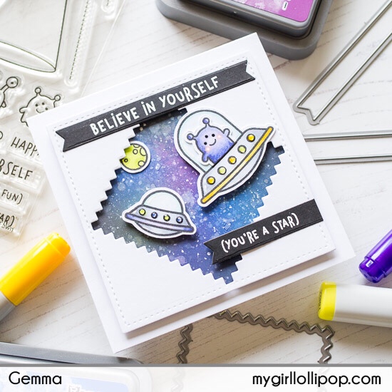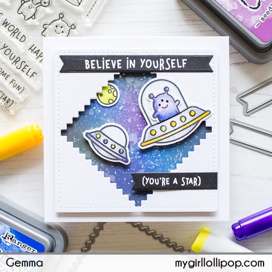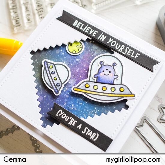 I trimmed down one of the aliens so he could fit in his spaceship, then added the images to the card, popping them up with foam tape. I also added a small planet to the galaxy background, from the Lawn Fawn Out of this World stamp set.