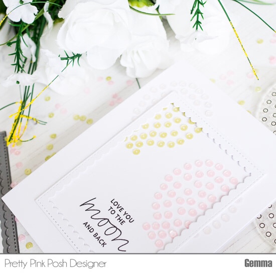 Anything inside the frame will have colour. I chose two colours of 4mm sequins – lime sorbet and pink blush. For the dots outside of the frame, I chose 4mm marshmallow sequins. These will cover the stamped dots and won’t be too visible on the white card stock base.
