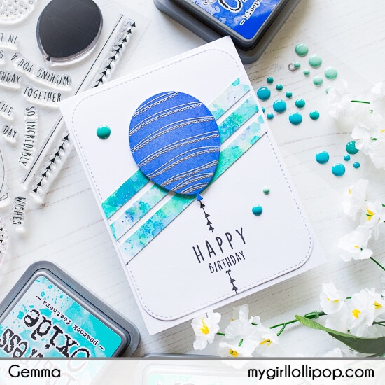 As these inks have pigment properties, its best to dry it with a heat tool first before heat embossing. I stamped one of the patterns from the set onto the balloon and used silver embossing powder to compliment the blues and greens on the card. I then die cut it with the coordinating die.