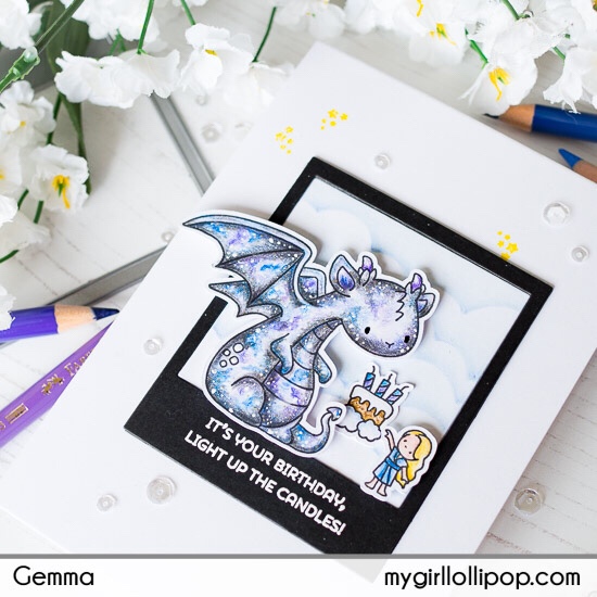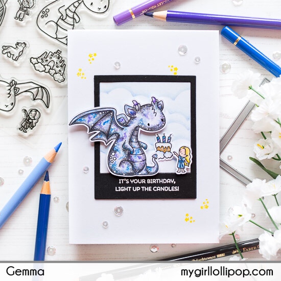 To make this into a card, I coloured a couple more images with pencils. The girl is from the same stamp set as the dragon, and the cake is from Mama Elephants Dragon Wishes stamp set.