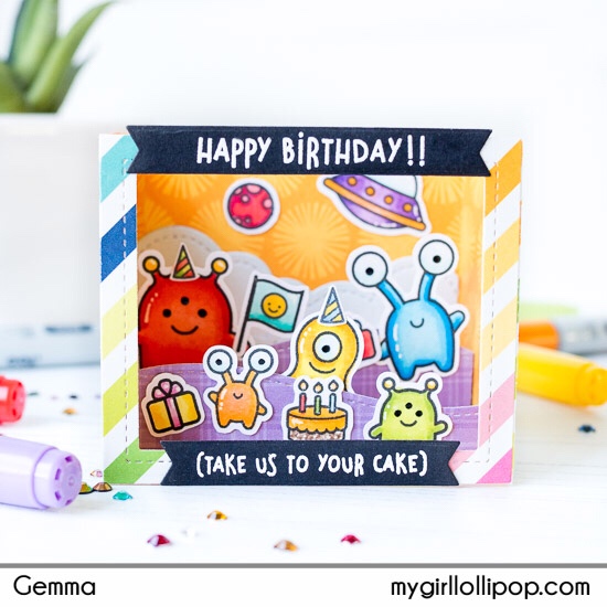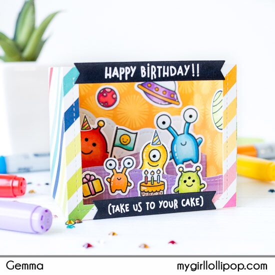 Wow! I love this super happy card design! Love the cute aliens in the bright and colorful shadow box! Thanks for celebrating our birthday with us at Lawn Fawnatics!