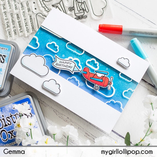 I stamped more images from the Plane and Simple stamp set, colouring them with alcohol markers and fussy cutting them out. I adhered the plane and banner on the acetate panel with foam tape, then a few clouds on the card panels to finish.
