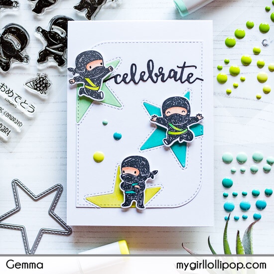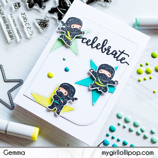 Next, I stamped three of the tiny ninjas and coloured them with alcohol markers. I love the sketchy style of these stamps and they don’t take long to colour. I added these to the card with foam tape.