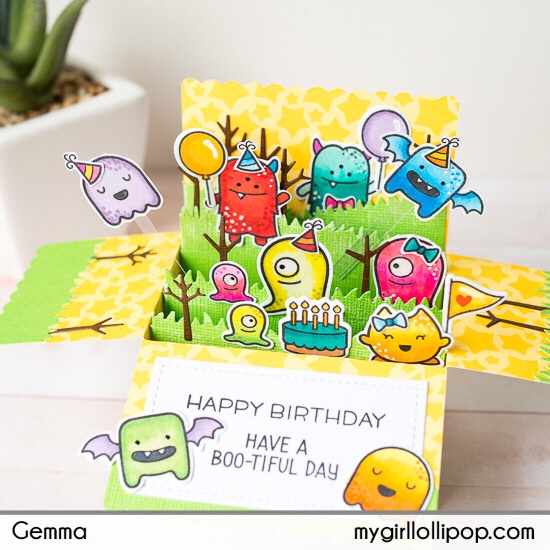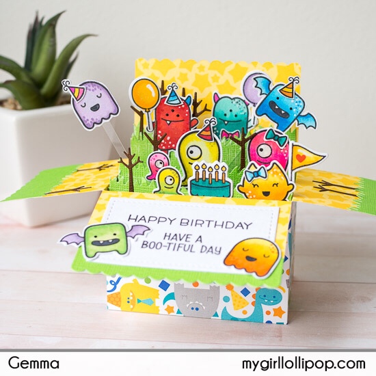 Today I’m sharing a monster birthday box card pop-up. The monsters popping out of the box when it’s opened are such fun, and I love to add some monsters on acetate strips for extra pop.