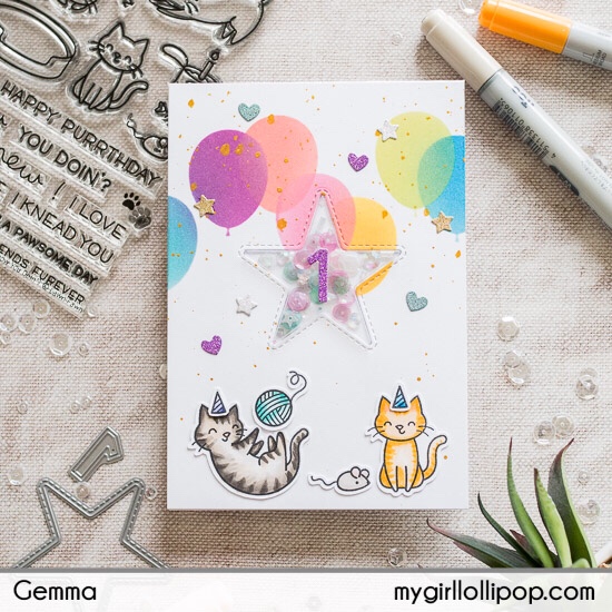 Next, I stamped and coloured some images from the Lawn Fawn Meow You Doin stamp set, then die cut them out. I adhered these to the card, adding some party hats and toys for the cats.