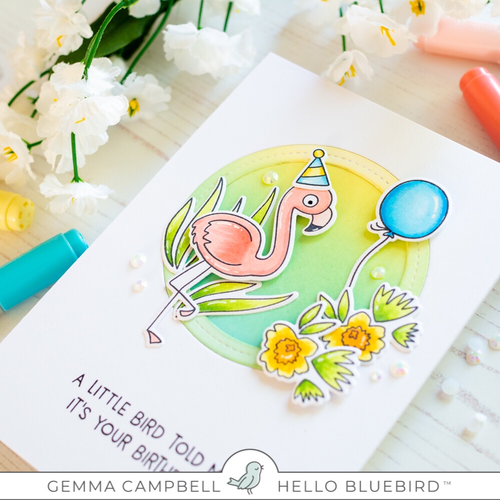 Today I’m sharing a card using a previously released set from Hello Bluebird. I just love the images in the Silly Birds set! The flamingo with the addition of a party hat is so funny and cute.