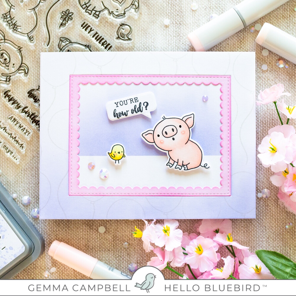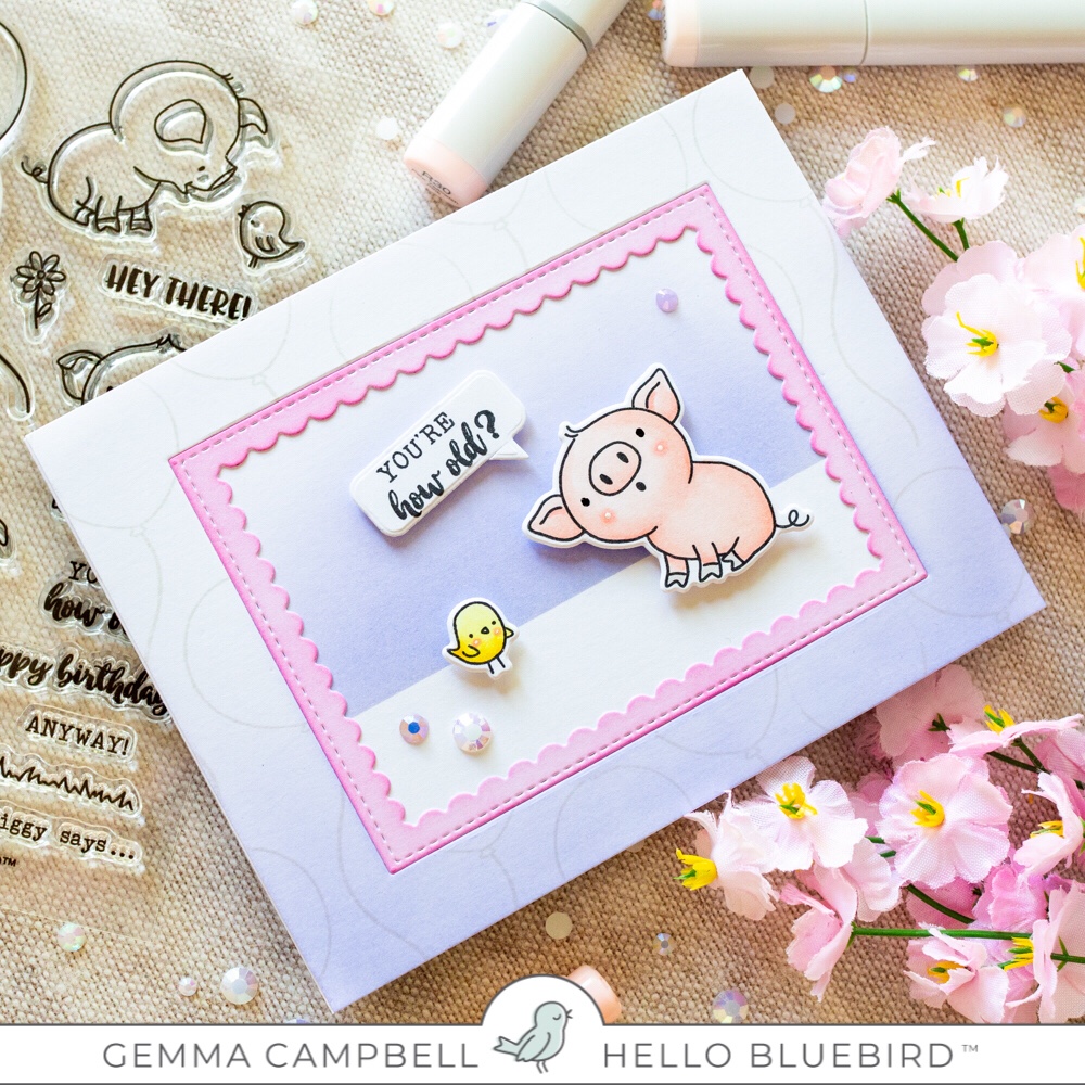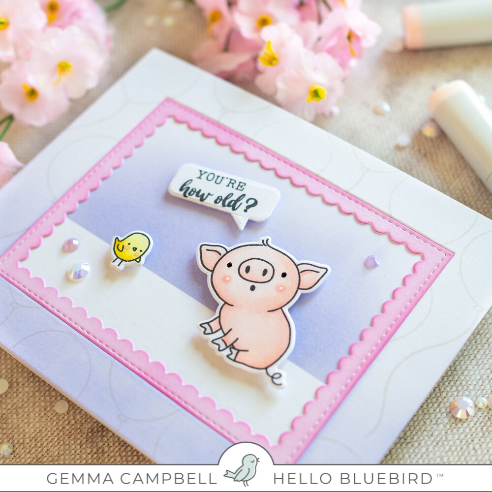 I adhered the top card panel and pink frame to the card base, then the pig and bird with foam tape.