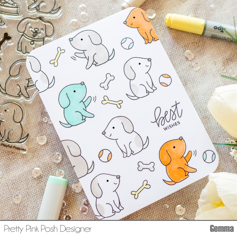 As the Playful Puppies stamp set from Pretty Pink Posh has dogs facing in both directions, it’s perfect for creating a pattern on a card.