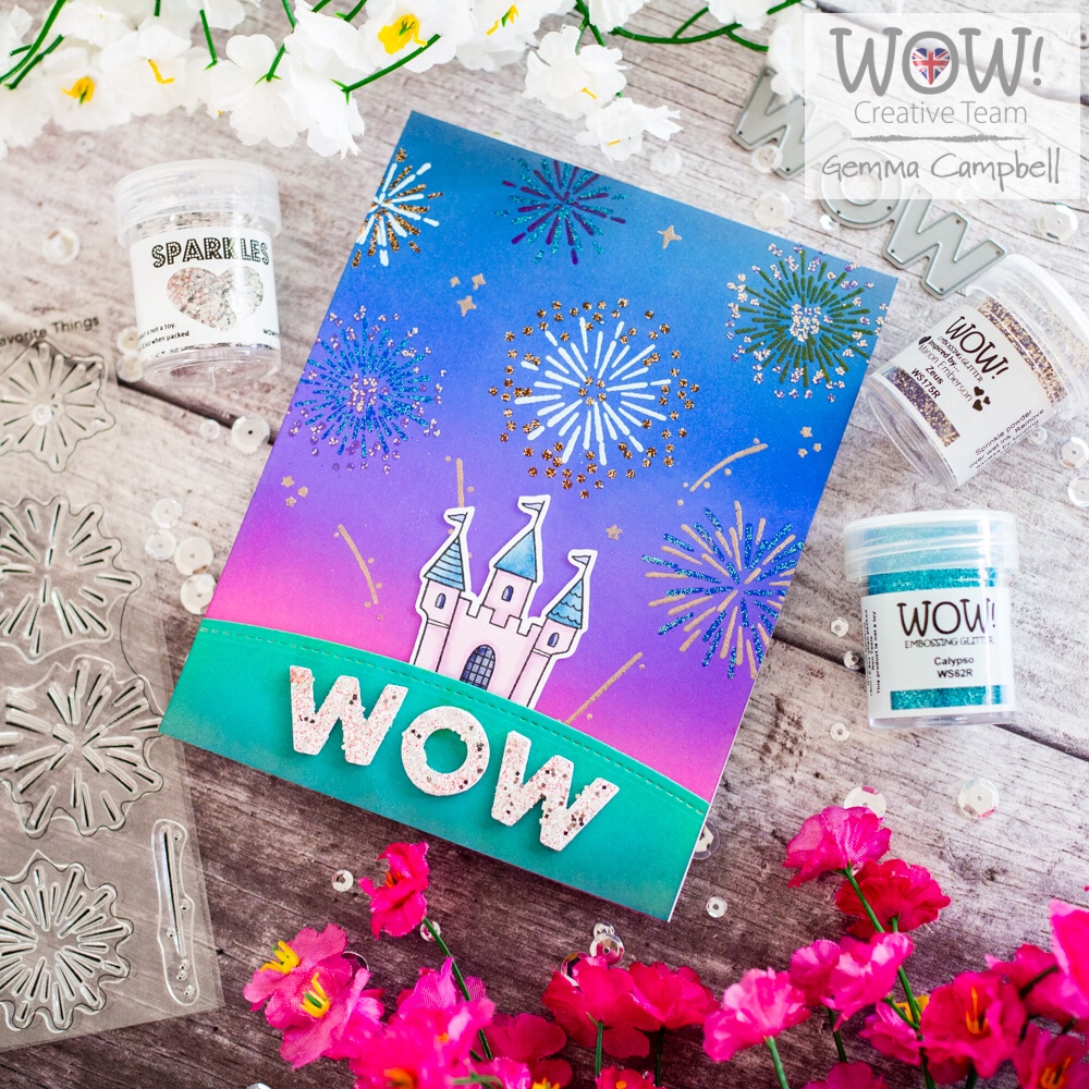 I wanted to share a card today to celebrate the news. This card was inspired by my recent family holiday to Disneyland Paris. The fireworks display over the Disney castle is amazing. Fireworks are perfect for having lots of fun with the fabulous embossing powders and glitters from WOW.