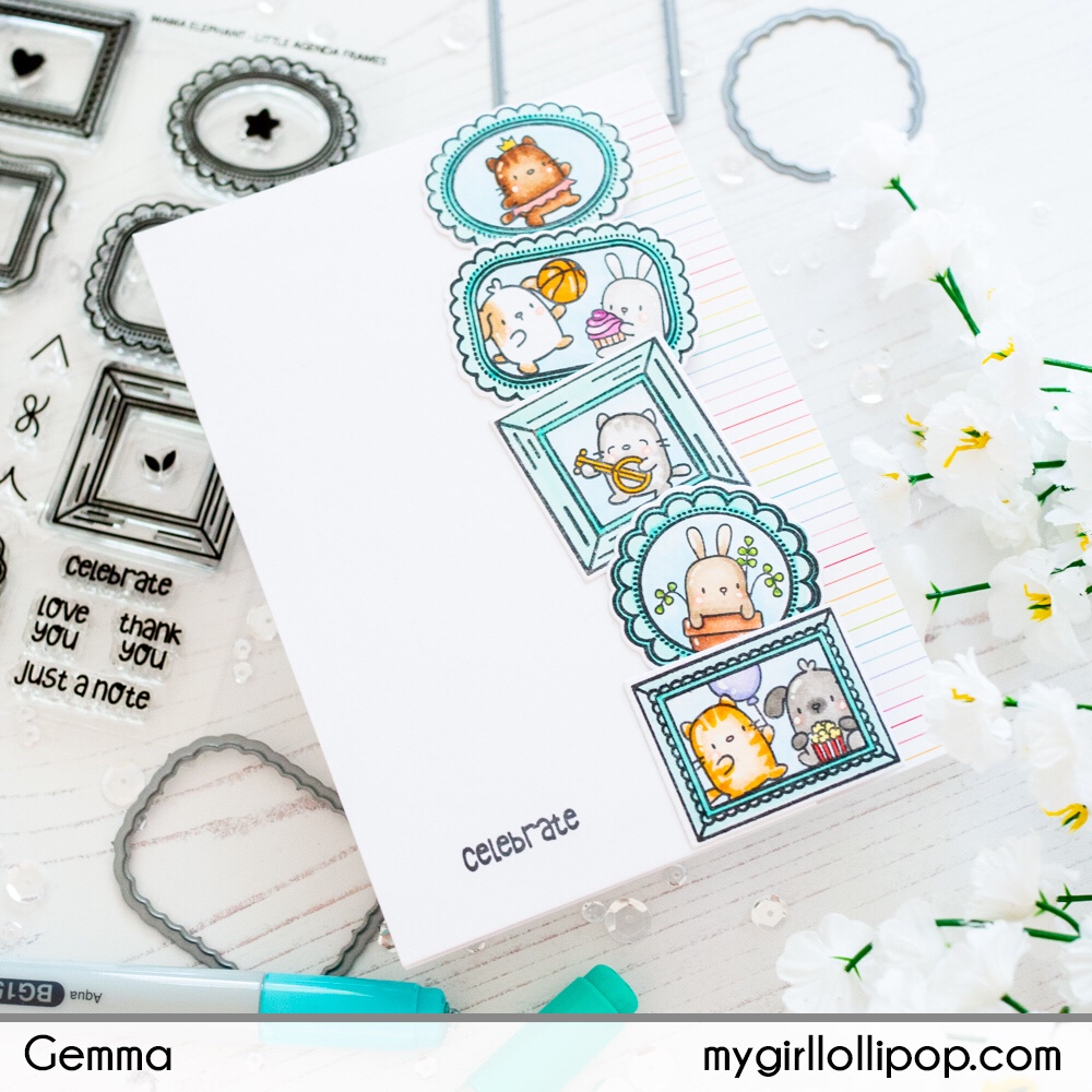 I wanted to use the Little Agenda frames to create a border edge on a card. I began by stamping the frames and some of the cute Little Agenda animals within them. I masked the edges of the frame when stamping the animals, so they look like photos inside the frames. I coloured the images with alcohol markers, then die cut the frames with the coordinating dies.