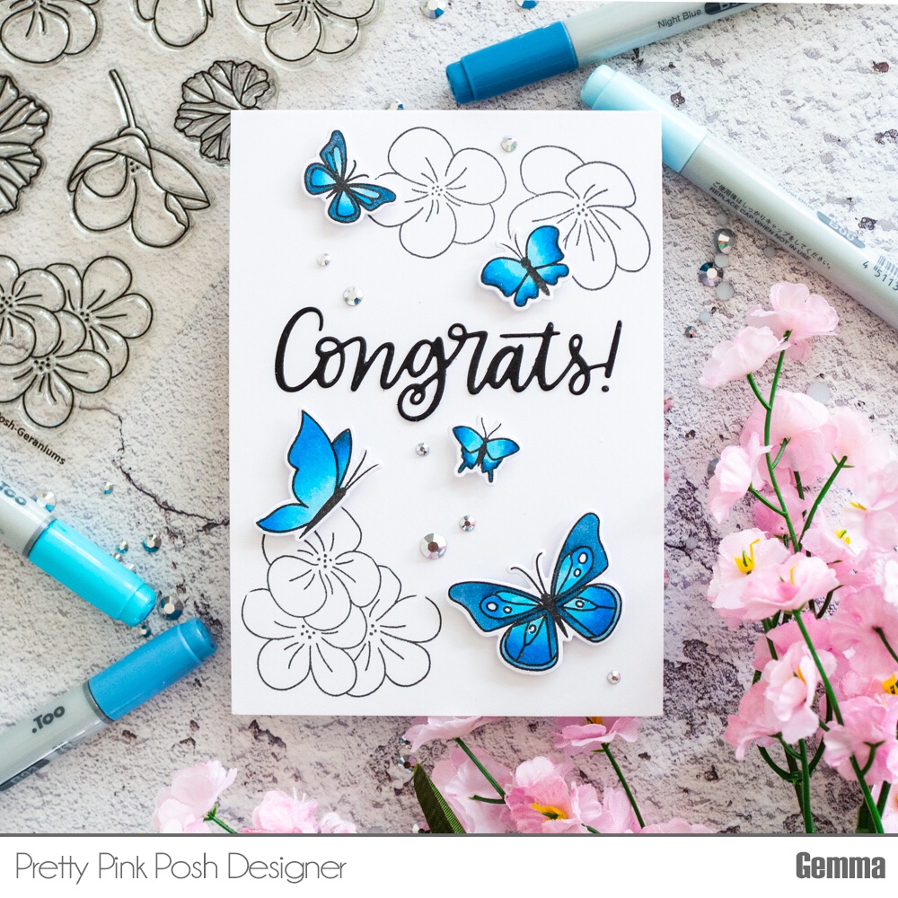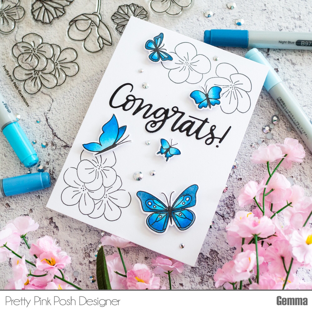 I shared a card recently featuring the Butterfly Friends set from Pretty Pink Posh. Click here to see that card. As it was one of my favourites, I decided to CASE it, adding some Pretty Pink Posh Geraniums this time.