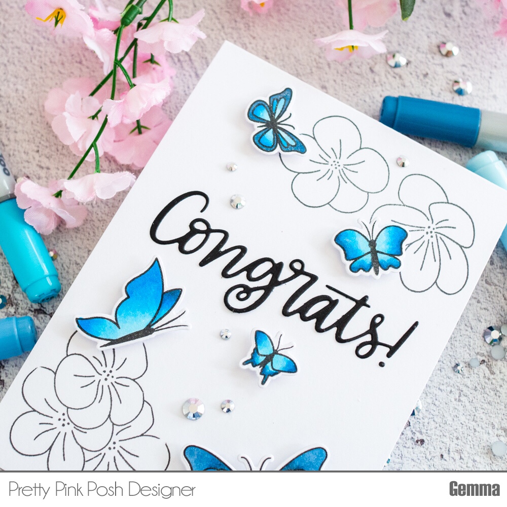 I added the butterflies to the card with foam squares, then adhered a black card Pretty Pink Posh Congrats script die cut to the centre.