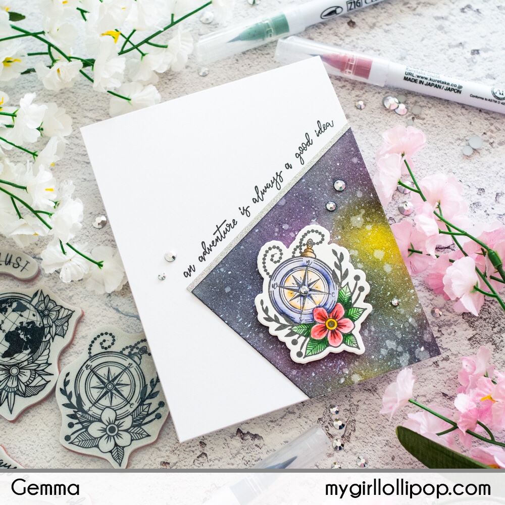 Next, I stamped the compass image from the Wanderlust set onto Bristol smooth paper, and water coloured it with zig pens. The softer watercolour gives it a nice vintage look. I die cut it out with the coordinating die.