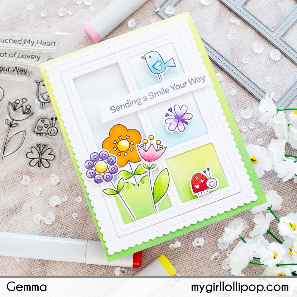 Today I have an acetate window card to share, which was inspired by a YouTube video from MFT design team member Stephanie. I love the look of the acetate window cards she created with the MFT Sending a Smile stamp set, so I thought I’d have a go at making my own version.