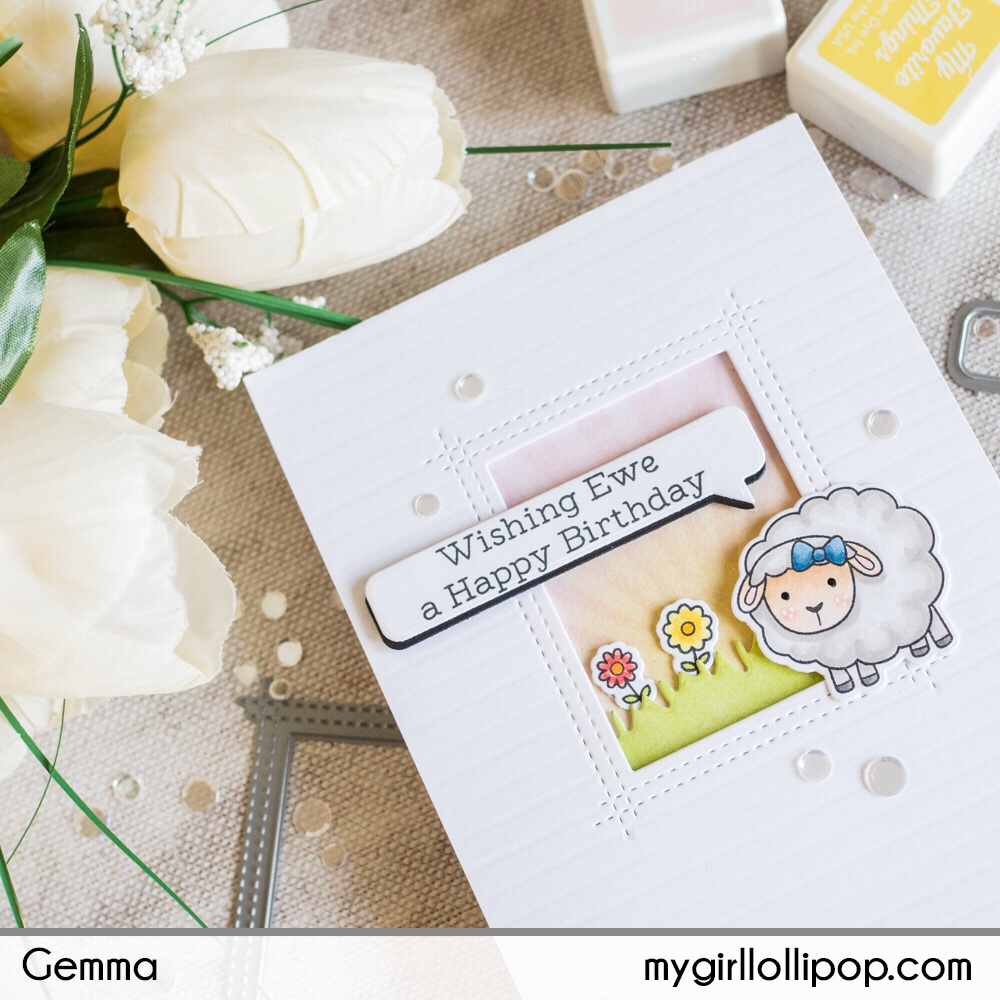 I stamped, coloured and die cut some images from the MFT Ewe and Me Forever stamp set. I layered a grassy hill behind the window, with some of the flowers tucked behind that. I then adhered the panel onto my card base with foam tape.