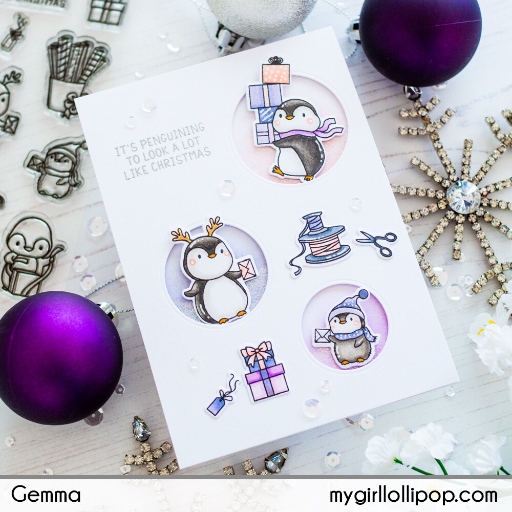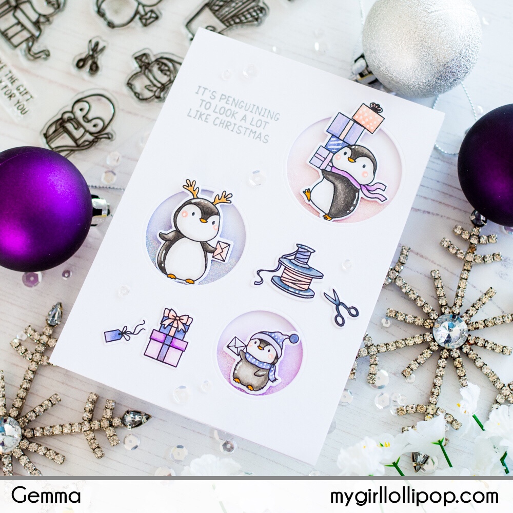 Love that big gift that the elves are on, so clever, and the penguins are just darling and I really love those soft purples in that card!