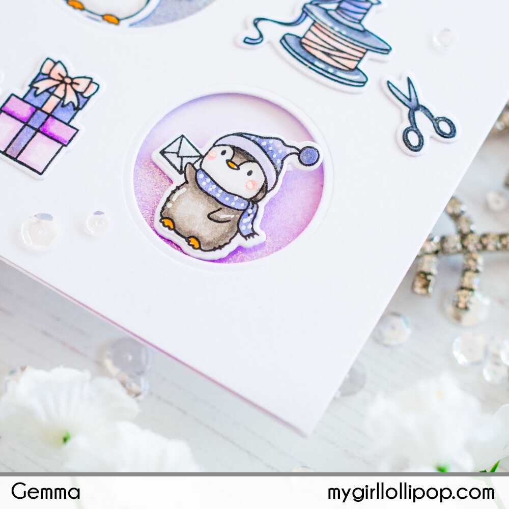 I stamped and coloured the Cool Penguins, using warm grey copic markers and adding some white gel pen details. I coloured the accessories with pinks and purples, then die cut all the images with the coordinating dies. I added the Cool Penguins to the card with foam tape, and the accessories with liquid glue. To finish, I added some Pretty Pink Posh clear sparkling sequins.