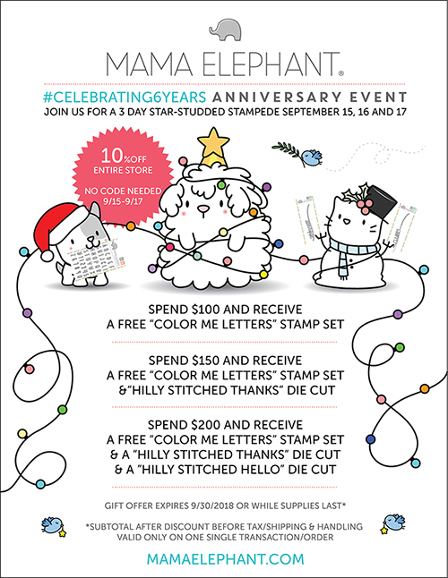 I’m so excited to be joining this very special stampede blog hop, celebrating Mama Elephant’s 6th Birthday and their September 2018 release!