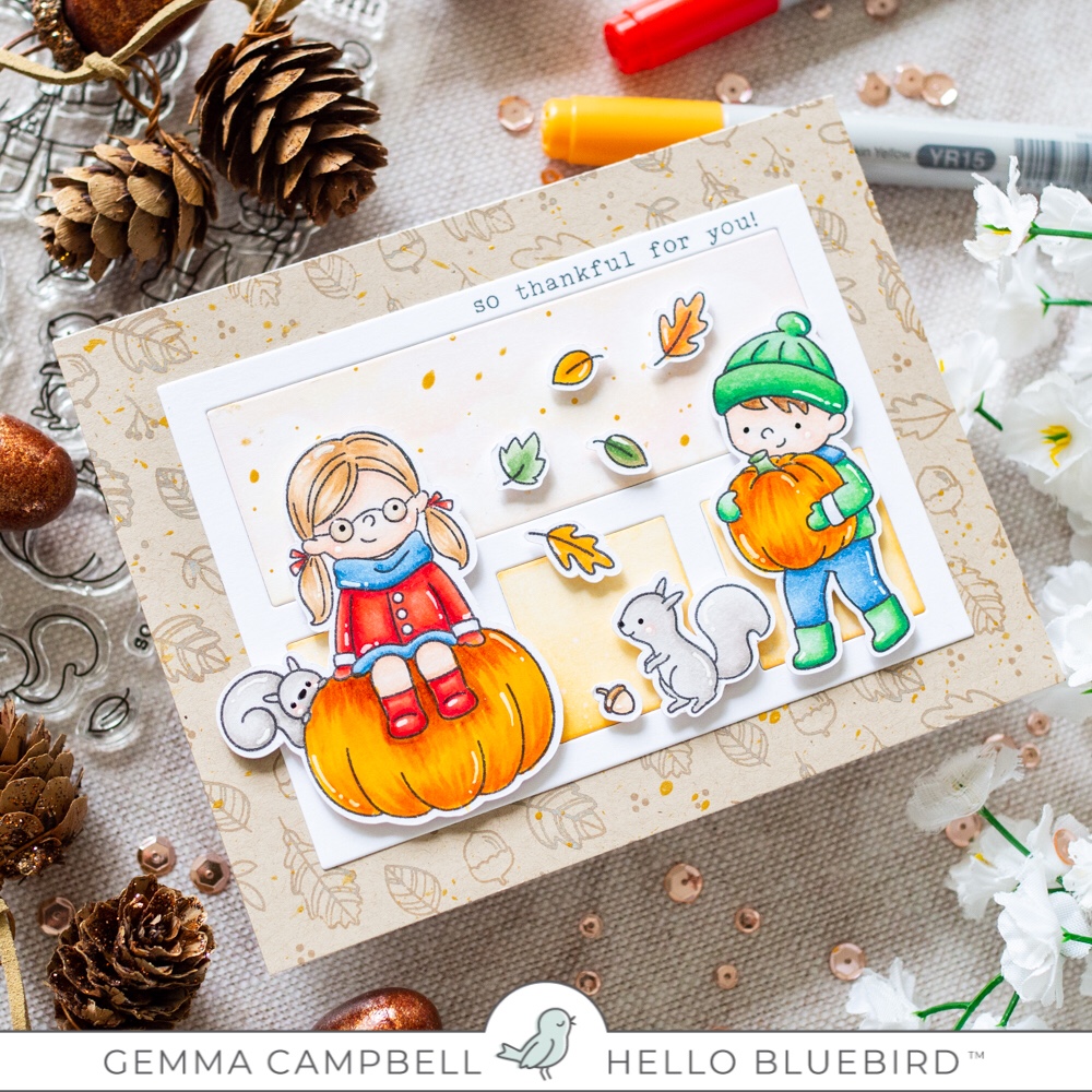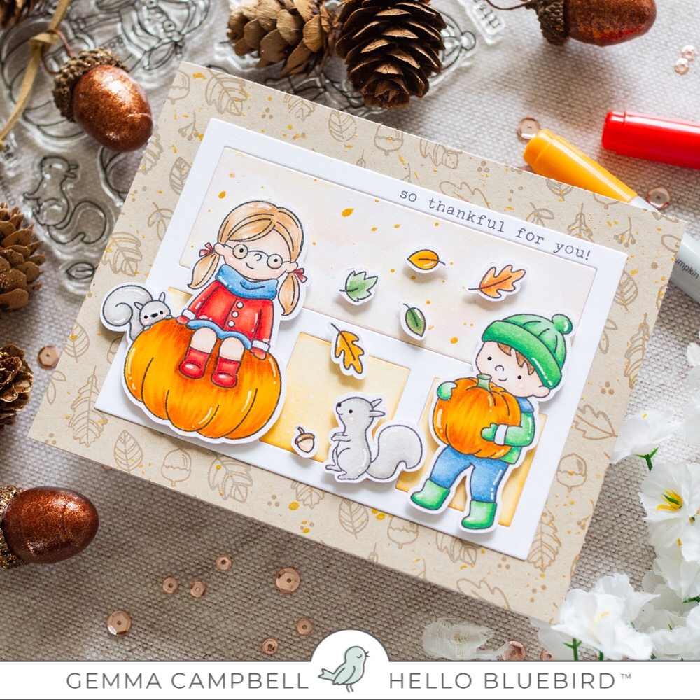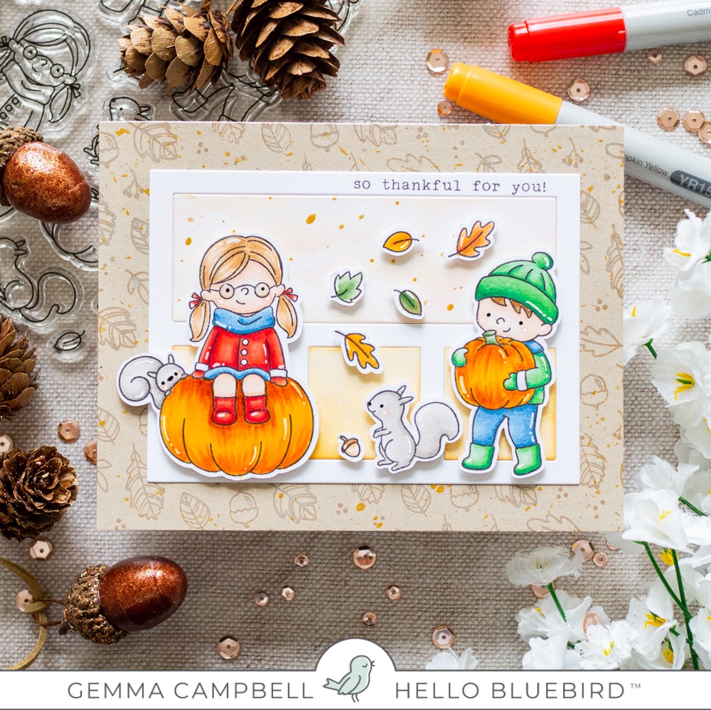 Today I’m sharing a card featuring the new Pumpkin Patch stamp set from Hello Bluebird. I was really taken with this stamp set when I saw it, as the little girl sat on the pumpkin reminds me so much of me as a child.