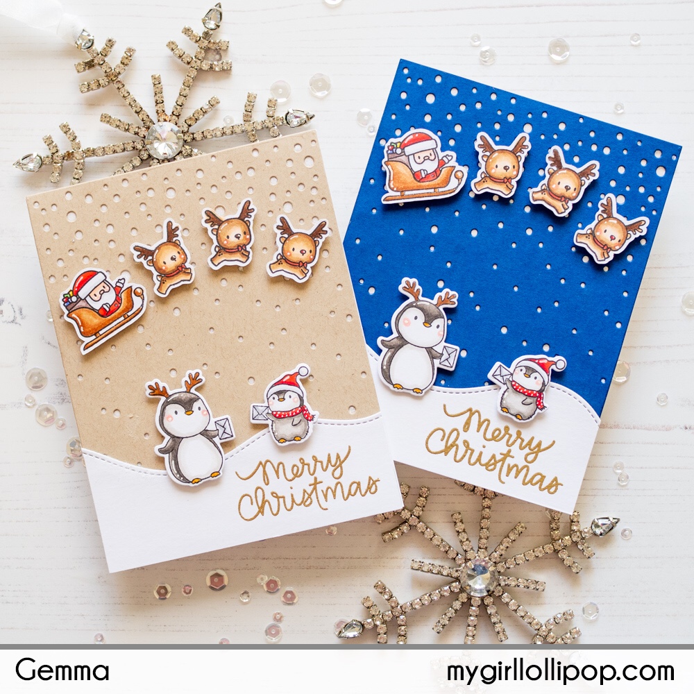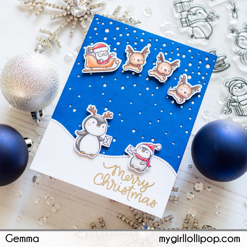I stamped and coloured some images from Mama Elephant Cool Penguins, and also the Mama Elephant Little Reindeer and Santa Agendas. I cut out all the images and added them to my card with foam tape to finish.